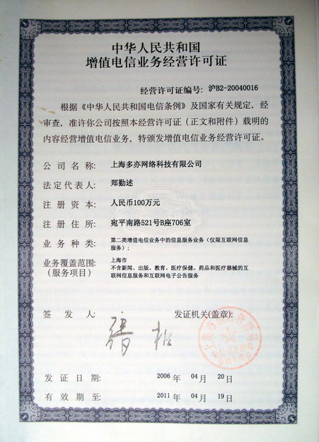 爱情网提供的是互联网信息服务,依照国务院在2000年9月颁布实施的《互联网信息服务管理办法》,我们获颁了互联网信息服务经营许可证,编号为沪B2-20040016: