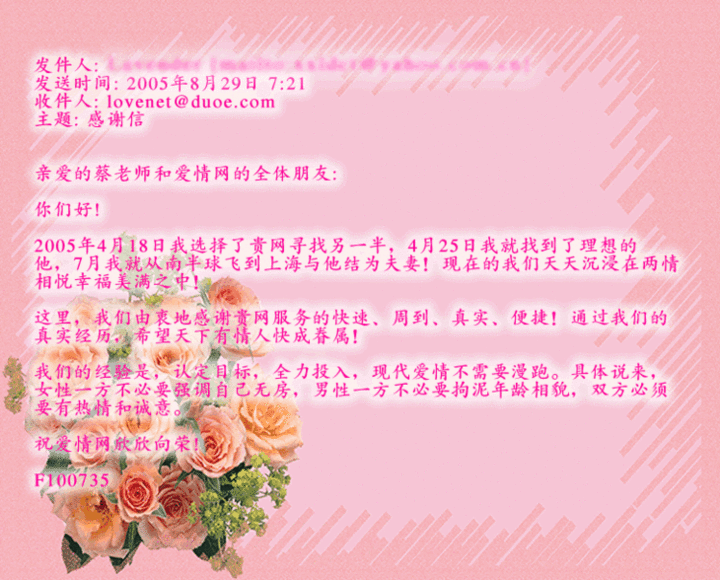 爱情网工作人员写信给F100735说:“您好!非常高兴收到您的喜讯,爱情网的全体工作人员祝您们幸福美满!已经删除了您的会员资料。另外,不知您的来信能否同意发布在爱情网“爱的喜讯”栏目?希望在百忙之中给我们回复。谢谢!”